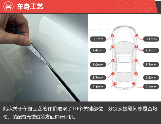 在车身工艺测试环节,整车共选取10个关键部位,每个关键部位都会选取3个关键点进行测量,以评价各关键部位缝隙的均匀程度。从测试结果来看,全车大多数关键部位的缝隙均值控制合理,仅右后翼子板至后备厢连接处的缝隙均值偏大,且左右两侧差值明显,对于整体测试结果造成一定影响。