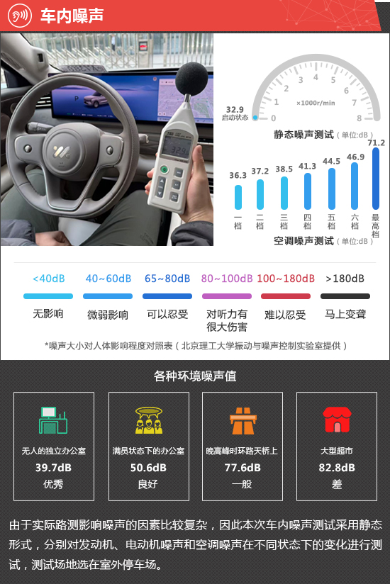 在静态噪声测试环节,2026款智己LS9在启动状态下车内实测噪声值为32.9dB,在测试过的同级别车型中处于上游水平。由于评测车搭载增程式动力系统,启动状态下发动机默认不工作,因此无法对2000rpm以及3000rpm的噪声进行测试。
