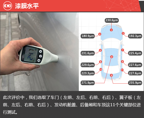 在漆膜水平测试环节,通过测试结果可以发现,整车漆膜平均厚度约为225.2μm,在测试过的同级别车型中处于上游水平。从各关键部位的测试数据来看,虽然多数关键部位的漆膜厚度值比较接近,但左右前翼子板处数值较低,车顶处的数值又明显偏高,可见漆膜厚度表现出色,但漆膜喷涂均匀性仍有提升空间。