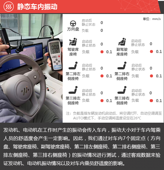 在静态车内振动测试环节,启动后静止和负载两种状态下,评测车方向盘位置的振动数值始终为0,三排座椅的振动数值也处于相对较低水平且两种状态下变化不大,对乘坐舒适性未造成影响。
